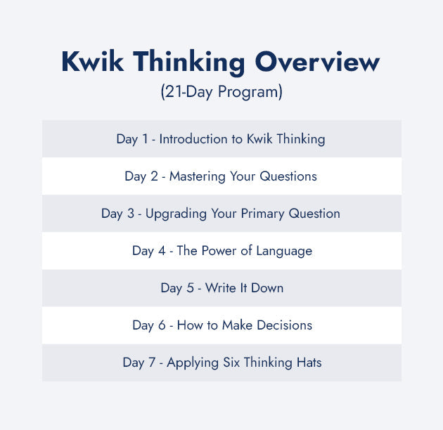 With my ultimate meta-thinking program called, Kwik Thinking, you and I will train for 21 days together to give you all the necessary tools to apply it towards what you're learning today.